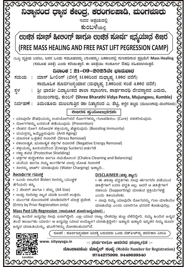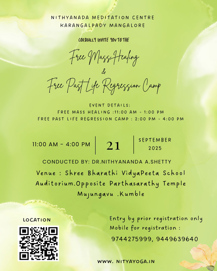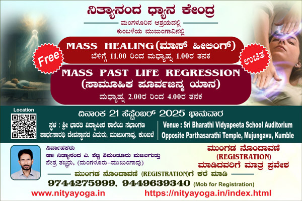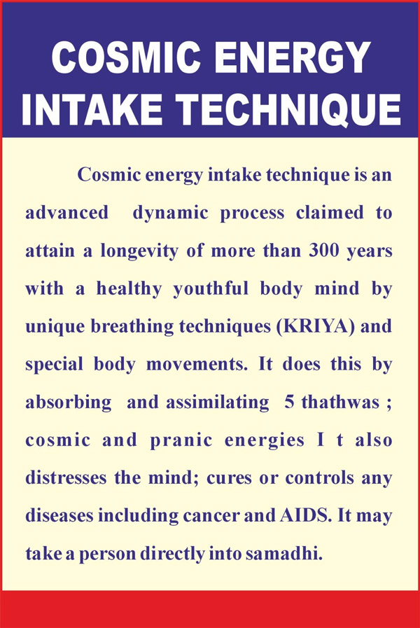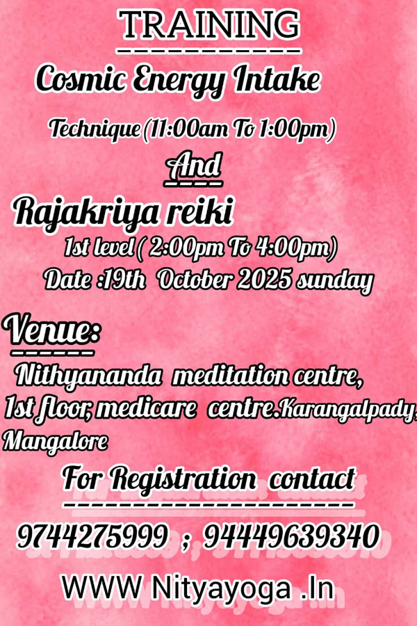 Please note that courses will be conducted by Dr Nithyananda.A.Shetty.Age limit for Cosmic energy intake technique is 16 years and above. Course fees for cosmic energy intake technique is 3000rs and for Rajakriya reiki is 1000rs